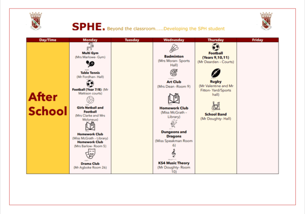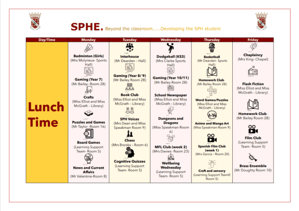 SPHE at St Philip Howard is delivered through a wide range of experiences that go beyond the classroom and help shape the whole child. This includes daily and weekly tutor time where students take part in reflection, discussion and relationship-building, as well as weekly Personal Development lessons covering key areas such as PSHE, RSE, careers, wellbeing, values and safety. Collective Worship and assemblies bring the school community together to reflect on faith, ethics, diversity and current issues. Students also take part in SPH Experience Days and workshops, which provide focused learning on important topics such as mental health, consent, drugs, and online safety. Beyond lessons, students can get involved in a rich extra-curricular offer including sports, arts, debate, wellbeing activities and more, alongside a wide selection of local, national and international educational visits. Student leadership is a key part of SPHE, with opportunities to serve as Mental Health Champions, Anti-Bullying Ambassadors, Diversity & Inclusion Leaders and other roles that promote positive change. Students also represent the school in events, competitions, chaplaincy, performances and public-facing activities, helping them develop confidence, character and a sense of responsibility.