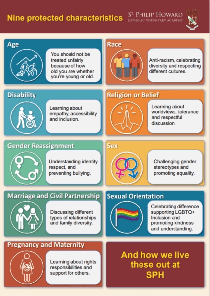 We also ensure that all students understand and respect the 9 Protected Characteristics of the Equality Act: Age, Disability, Race, Religion or belief, Sex, Sexual orientation, Gender reassignment, Pregnancy & maternity and Marriage & civil partnership.