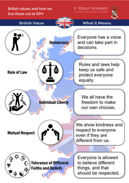 Our SPHE programme actively promotes the Fundamental British Values of: Democracy, Rule of Law, Individual Liberty, Mutual Respect and Tolerance of those with different faiths and beliefs